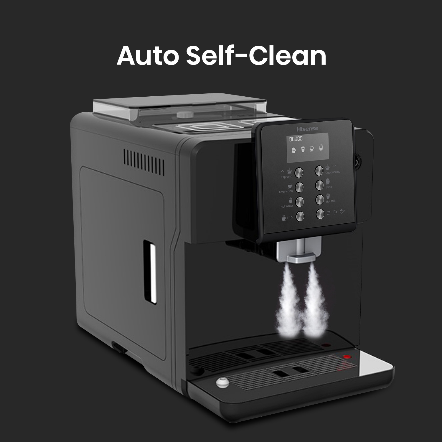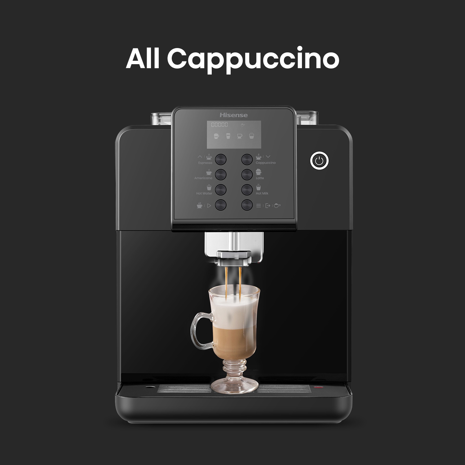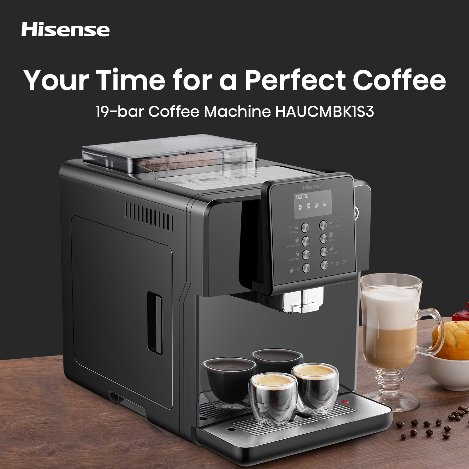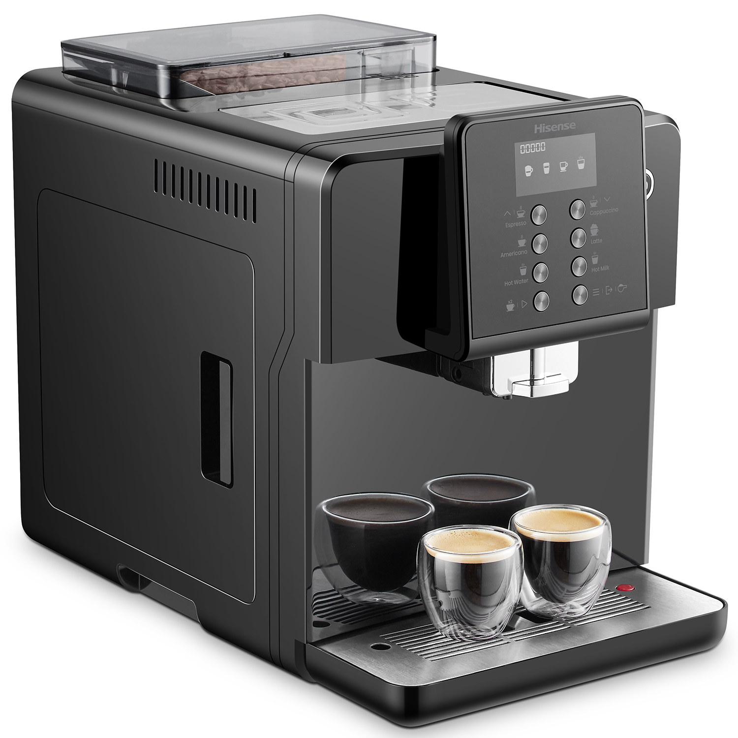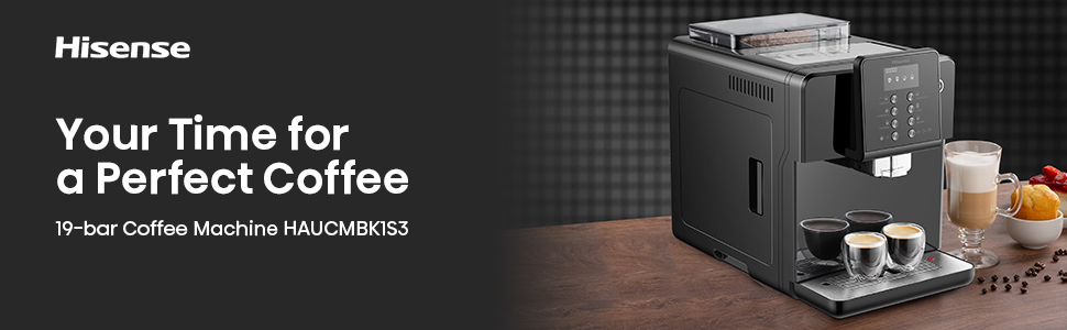 Hisense One touch Cappuccino With Visual display operating system LCD, Bean to cup brewing, Powder to cup brewing, ECO mode, 4 languages selection in menu.