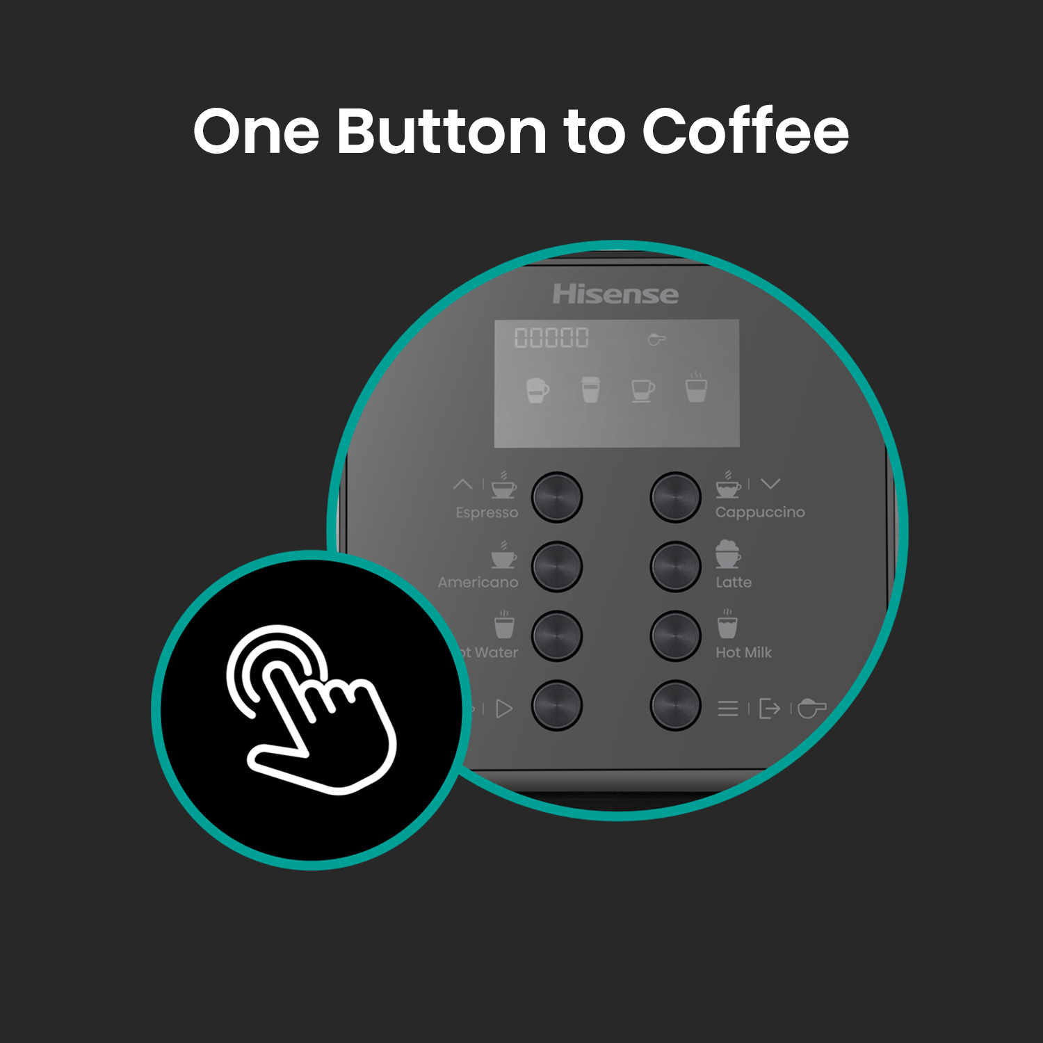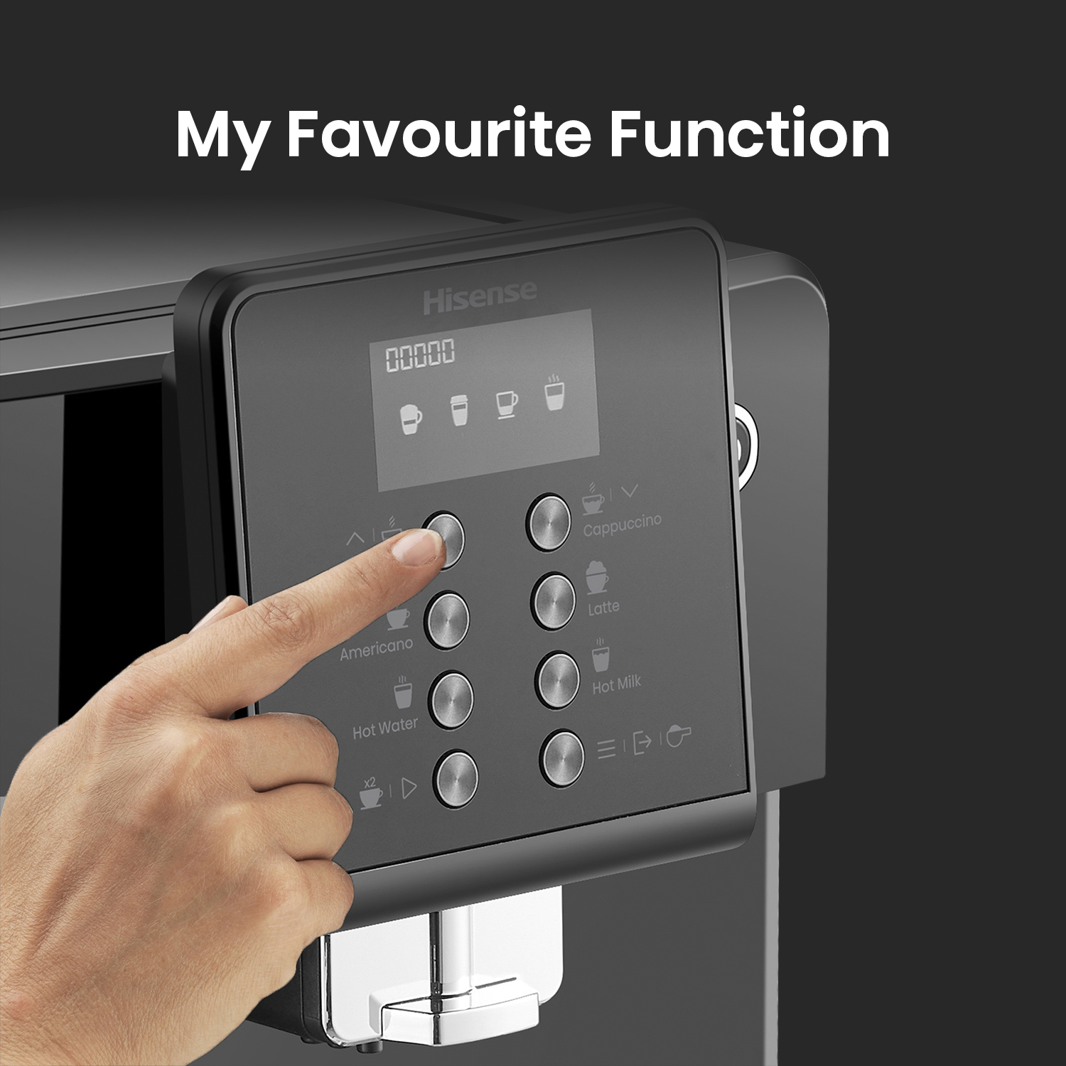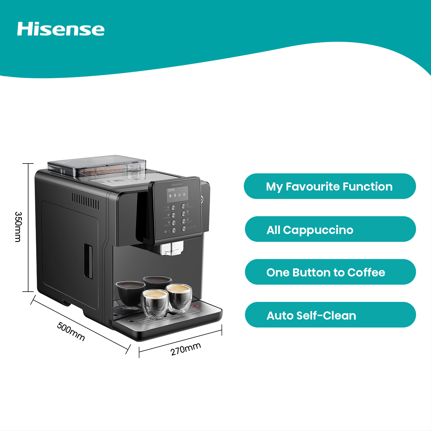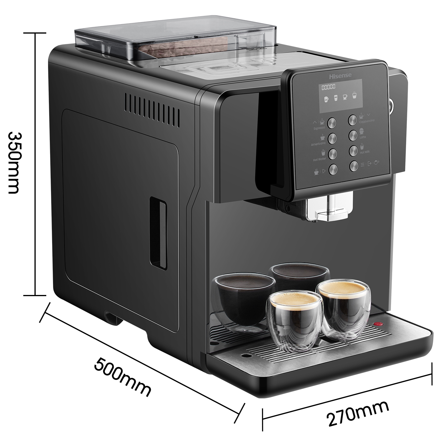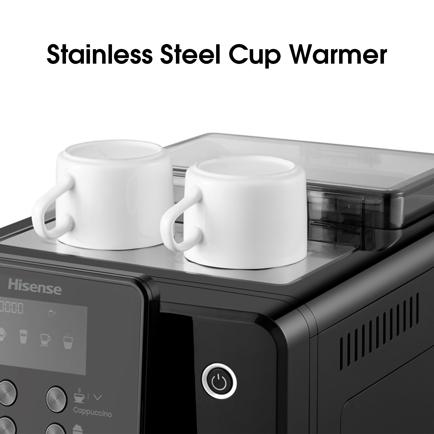 Hisense One touch Cappuccino With Visual display operating system LCD, Bean to cup brewing, Powder to cup brewing, ECO mode, 4 languages selection in menu.