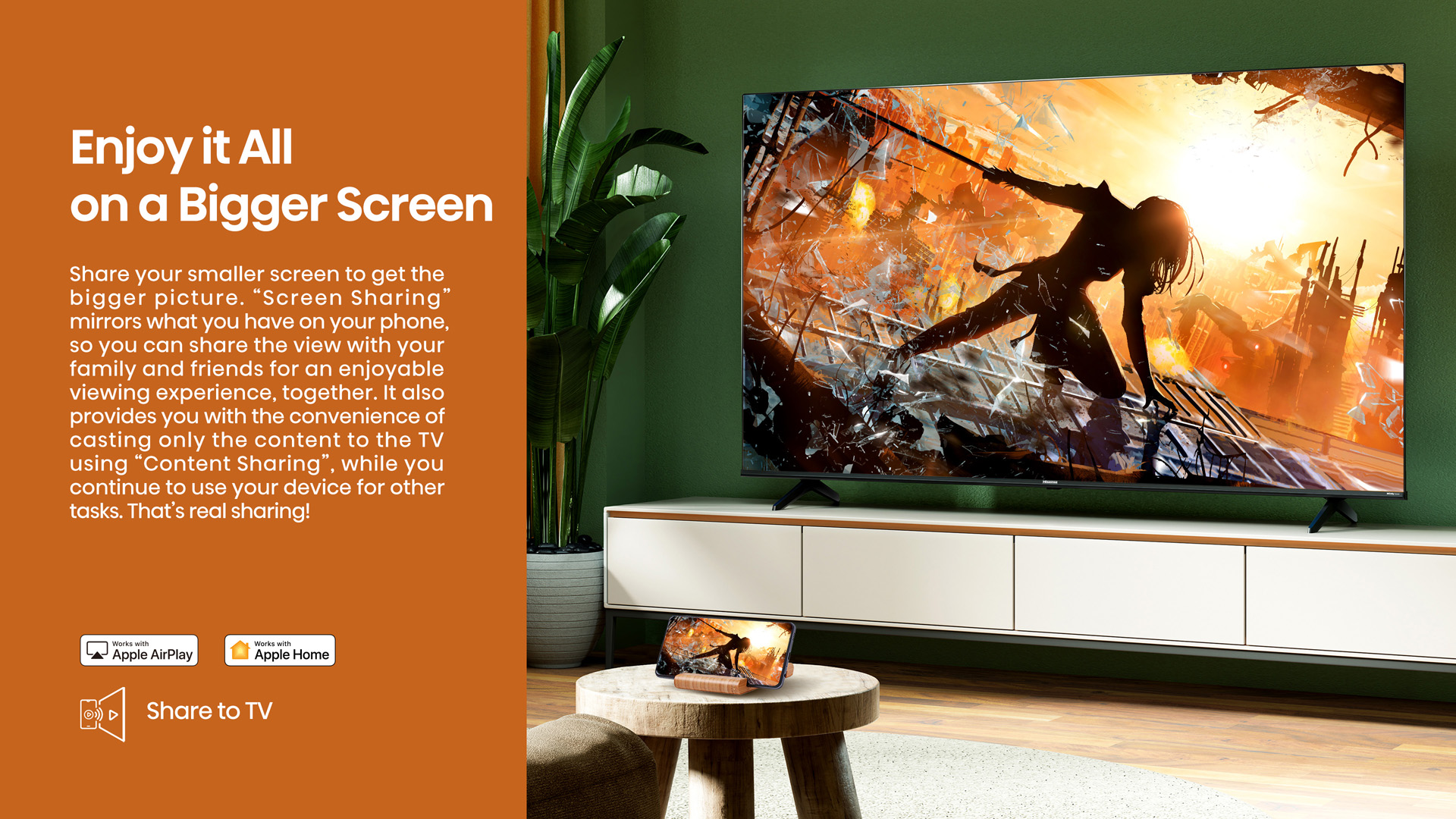 The Share-to-TV function lets you bypass this issue with ease and grace. Share content from your other devices directly to your screen. Use “Screen Sharing” to mirror your device on your TV, or the “Content Sharing” option, which lets you continue to use your device while only sharing specific media on the big screen for everyone to enjoy.