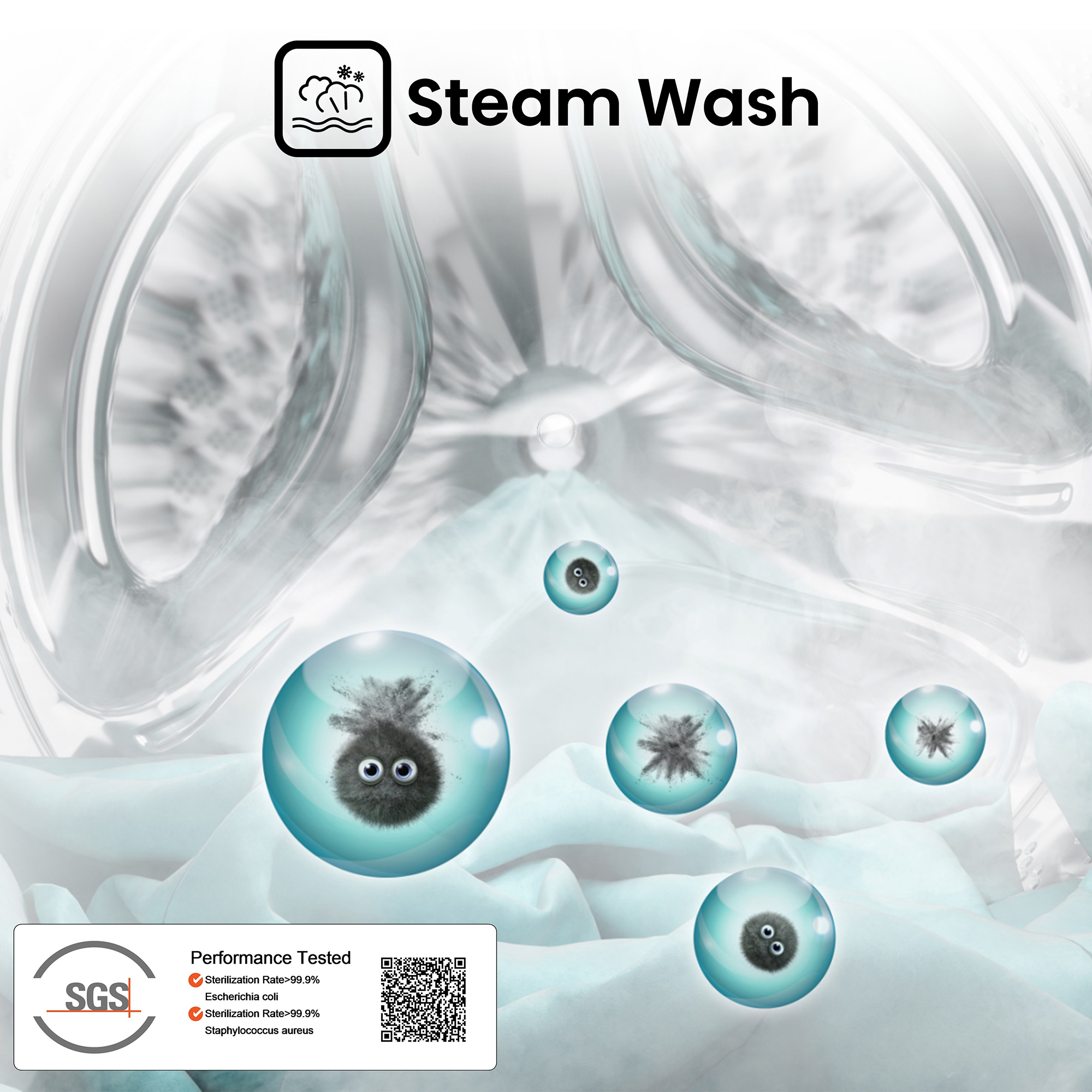 - 【Steam Wash Technology】 Removes 99.9% of bacteria giving you a deep clean free of harmful germs The high-temperature steam is released from the bottom of the drum and the steam fully penetrates the clothes, which can eliminate 99.9%* of Escherichia coli and Staphylococcus aureus attached to the clothes